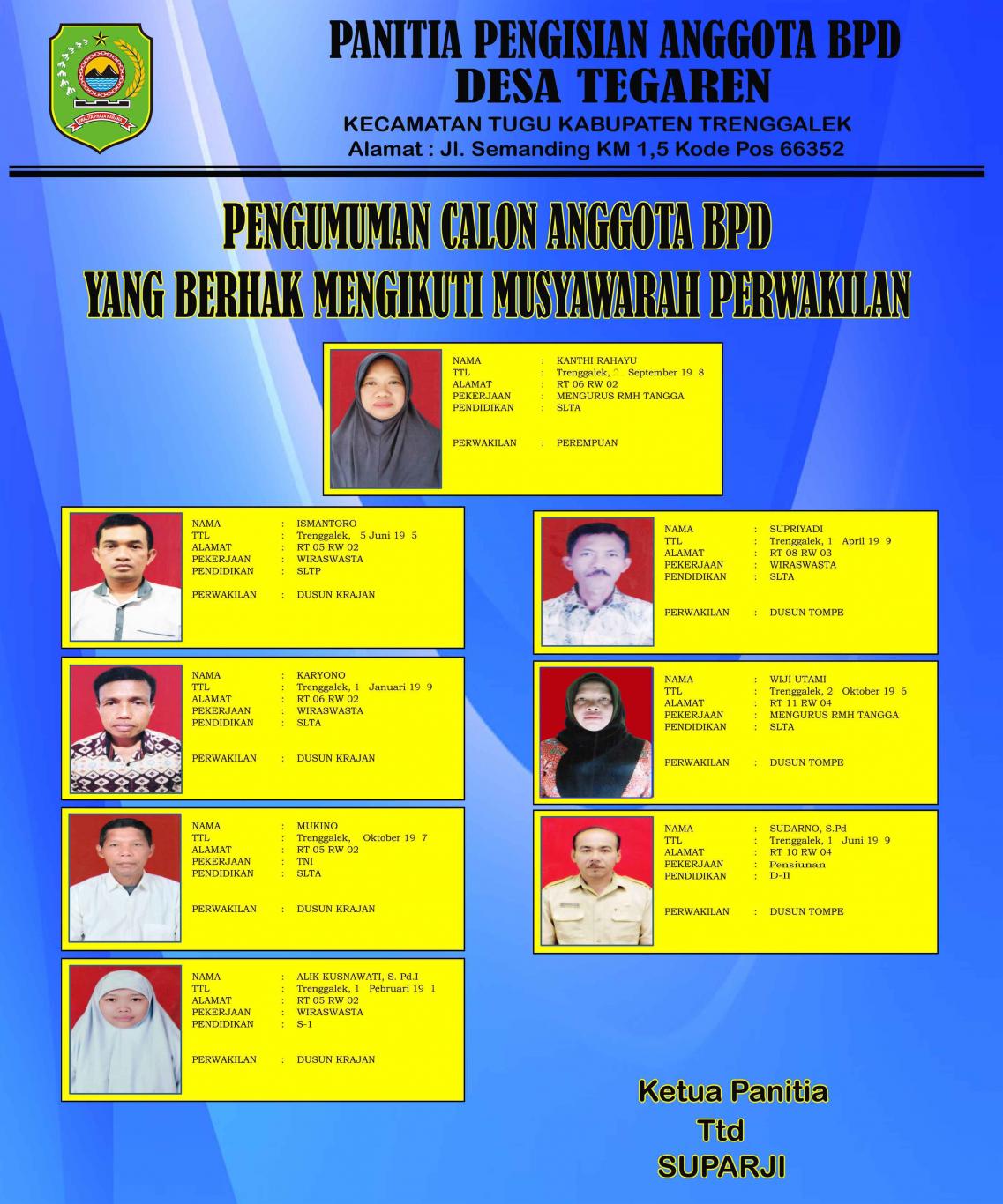 Jumlah Bakal Calon Anggota BPD yang memenuhi persyaratan administratif sebanyak 8 orang dari 8 orang pendaftar, yaitu: