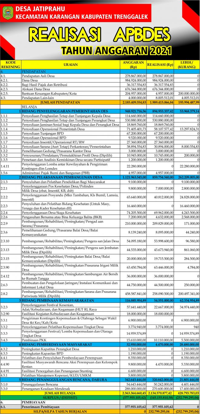 Infografis ini dibuat berdasarkan Peraturan Desa Jatiprahu Nomor 1 Tahun 2022 tentang Laporan Pertanggung Jawaban Realisasi Pelaksanaan Anggaran Pendapatan Dan Belanja Desa Jatiprahu Tahun Anggaran 2021