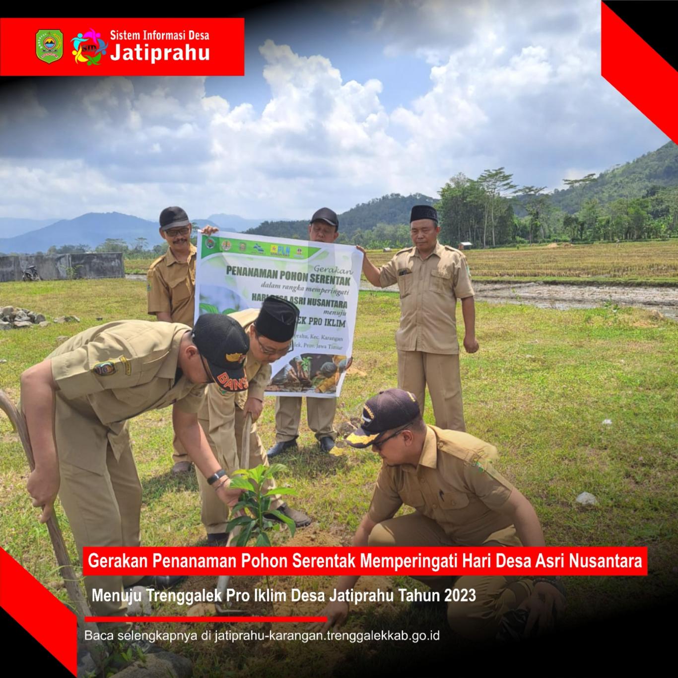 "Alhamdulillah Desa Jatiprahu bisa ikut serta melaksanakan Gerakan Penanaman Serentak dalam peringatan Hari Desa Asri Nusantara tahun 2023. Saya sangat senang dan bangga Desa Jatiprahu bisa berpartisipasi dalam kegiatan ini untuk menuju Trenggalek Pro Iklim, ujar Slamet Riyadi. (Sinta Hardianti)