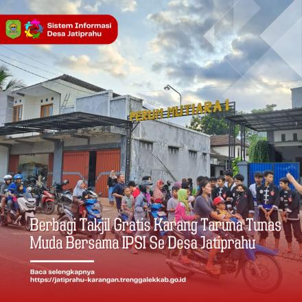 Jatiprahu, (SID JATIPRAHU) – Kegiatan berbagi takjil yang dilakukan oleh Karang Taruna "Tunas Muda" Bersama IPSI se Desa Jatiprahu hari Minggu 31 Maret 2024 merupakan kegiatan pertama kalinya di bulan Ramadhan tahun ini.