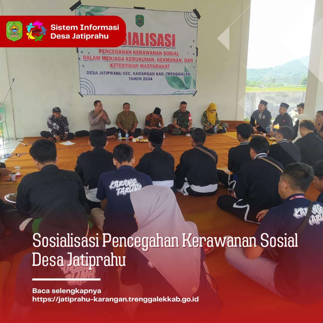 Kegiatan ini dihadiri oleh Kepala Desa, Perangkat Desa, BPD, Perguruan Pencak Silat PAGAR NUSA, PSHT, IKSPI & Karangtaruna Desa Jatiprahu. Pemateri sosialisasi ini diisi oleh Camat, Kapolsek, Danramil Kecamatan Karangan dan diikuti dengan antusiasme tinggi dari para hadirin, dengan adanya sosialisasi ini diharapkan masyarakat dapat lebih peka terhadap potensi kerawanan sosial dan bersama-sama menjaga keamanan serta ketertiban di lingkungan Desa Jatiprahu. (Sinta Hardianti)